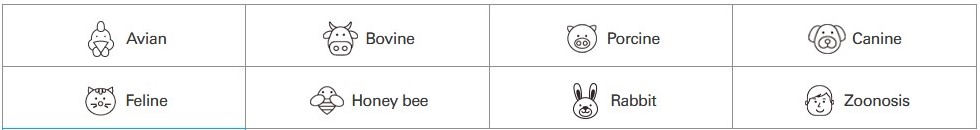 Intron hat eine breite Produktpalette mit unterschiedlichen Techniken von real-time-PCR, PCR bis hin zu Schnelltests für Erreger in unterschiedlichsten Tieren wie Schwein, Bienen, Hund, Katze, Rind und spezielle Tests für Halal und Mycoplasmen